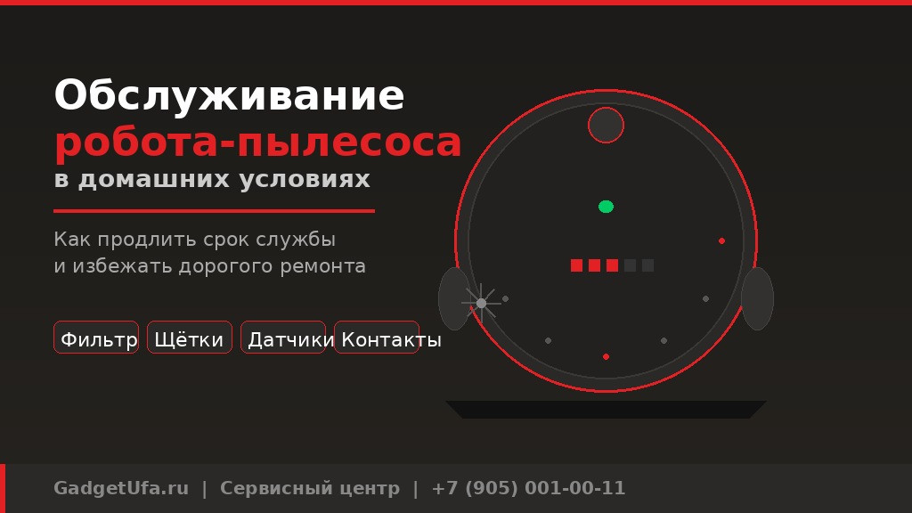 Контейнер — после каждой уборки. Щётки — раз в неделю. Фильтр — раз в 2 недели. Датчики и контакты — раз в месяц.