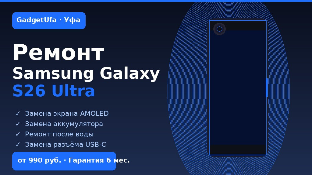 Samsung Galaxy S26 Ultra — флагман 2026 года с мощнейшим процессором, продвинутой камерой и стилусом S Pen. Это дорогое устройство, и когда что-то идёт не так — треснул экран, вздулся аккумулятор, сломался разъём — важно обратиться в проверенный сервисный центр. В GadgetUfa в Уфе мы специализируемся на ремонте смартфонов Samsung, включая самые новые флагманы Galaxy S-серии.