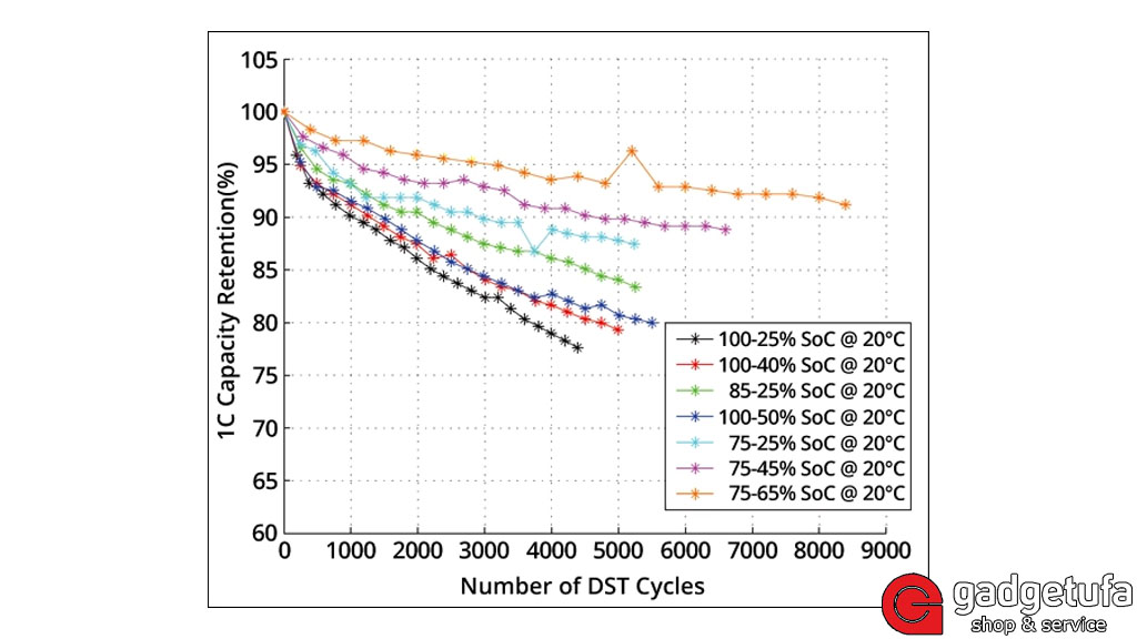 Согласно этим данным, наибольший износ аккумулятора наблюдается при разряде полностью заряженной батареи до уровня около 25% (черная линия)— в этом режиме потери ёмкости максимальны. Эксплуатация аккумулятора в диапазоне примерно от 85% до 25% (зеленая линия) позволяет заметно увеличить срок его службы по сравнению со сценарием зарядки до 100% и последующей разрядки до 50% (синяя линия). Минимальная деградация достигается при ещё более узком диапазоне — когда аккумулятор заряжается лишь до 75% и разряжается до 65% (оранжевая линия). Однако такой режим существенно ограничивает фактическое использование ёмкости батареи. Также специалисты отмечают, что повышенное напряжение и высокая температура негативно влияют на состояние аккумулятора.